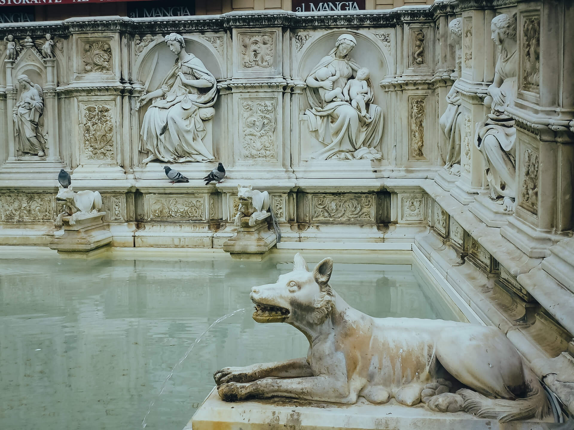 On the opposite side of Piazza del Campo stands a beautiful fountain. The Fountain of Gaia (joy) is rectangular-shaped and lined with statue figures. Unfortunately, none of those statues are the originals. Instead, the originals are stored, safe and secure, in a museum. The entire fountain is a shrine to the women, animals, and religious stories most dear to the Sienese people. The focal point is a statue of the Madonna and Child. Lining the walls of the fountain are reliefs portraying the biblical story of Genesis. Water spouts out of the mouths of wolves, paying homage to the legendary she-wolf that raised Remus and Romulus.