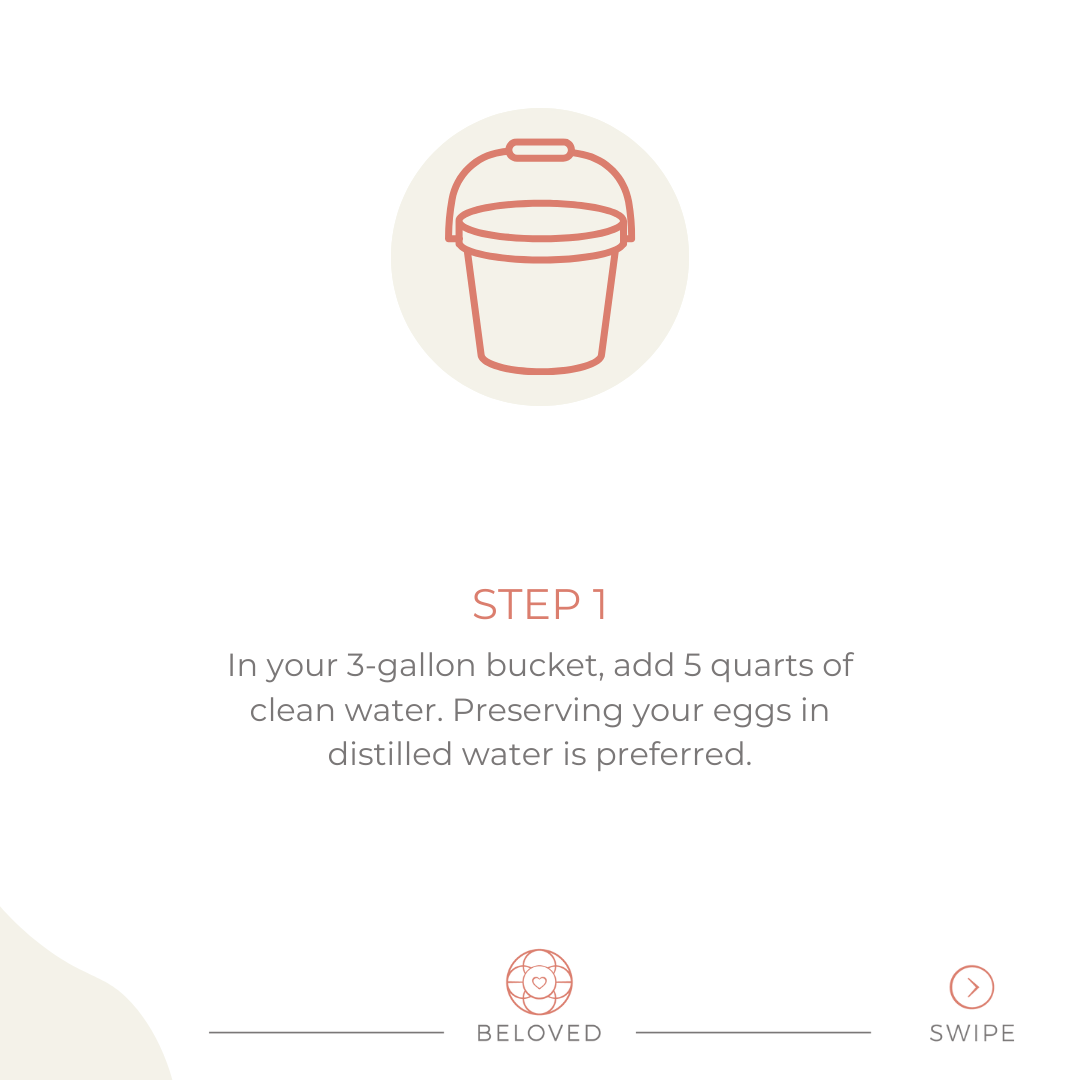 In your 3-gallon bucket, add 5 quarts of clean water. Preserving your eggs in distilled water is preferred.