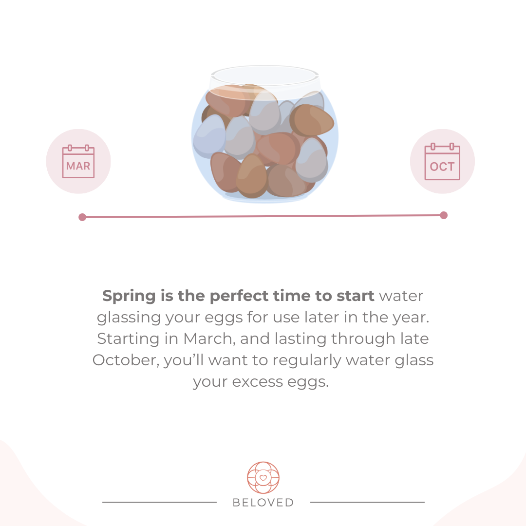 Spring is the perfect time to start water glassing your eggs for use later in the year. Starting in March, and lasting through late October, you’ll want to regularly water glass your excess eggs. This way, you can enjoy farm-fresh eggs through the cold winter months, when there are fewer daylight hours and hens naturally reduce their laying frequency.