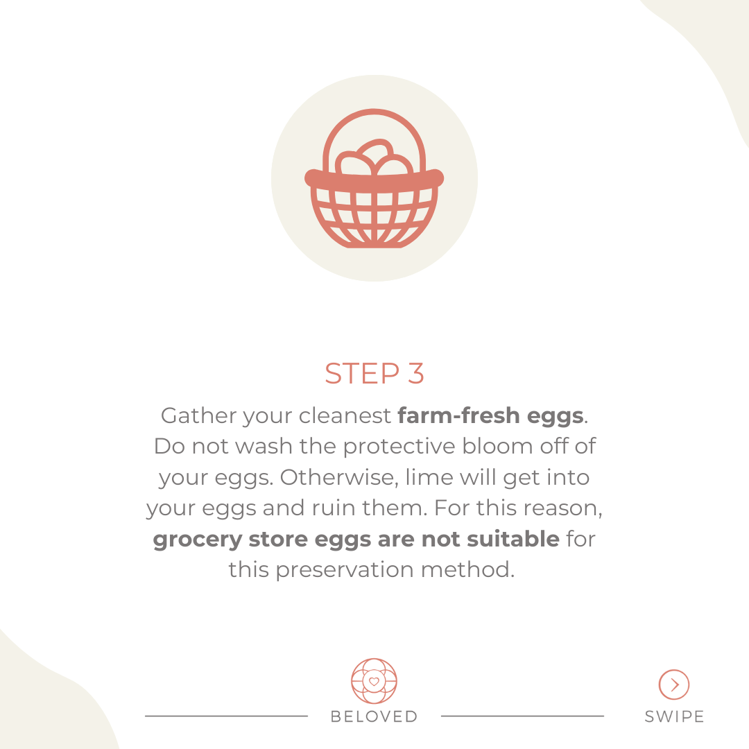 Gather your cleanest farm-fresh eggs. Do not wash the protective bloom off of your eggs. Otherwise, lime will get into your eggs and ruin them. For this reason, grocery store eggs are not suitable for this preservation method.
