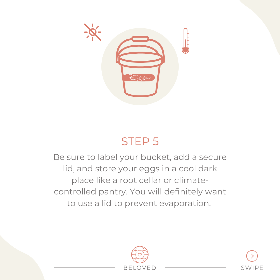 Be sure to label your bucket, add a secure lid, and store your eggs in a cool dark place like a root cellar or climate-controlled pantry. You will definitely want to use a lid to prevent evaporation.