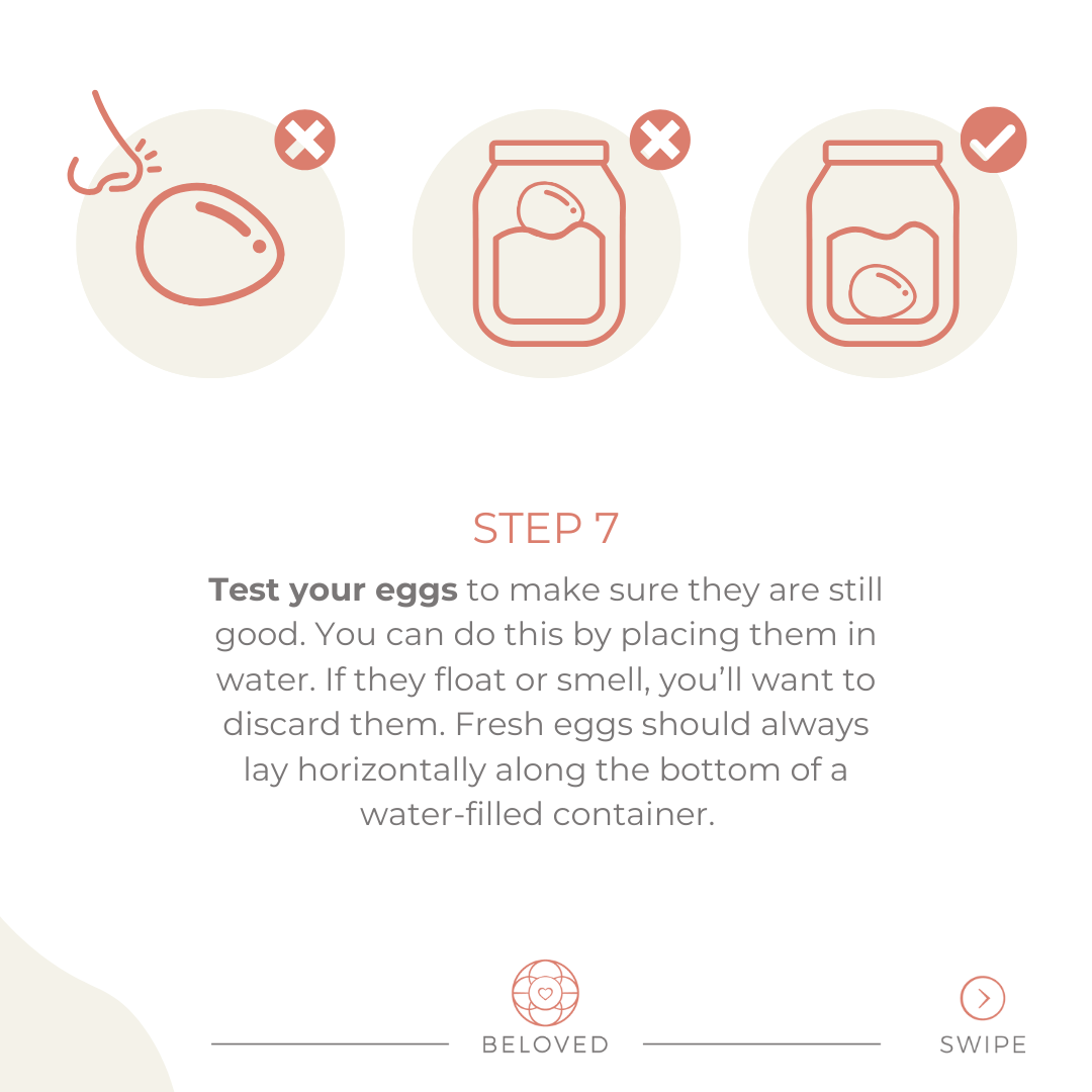 Test your eggs to make sure they are still good. You can do this by placing them in water. If they float or smell, you’ll want to discard them. Fresh eggs should always lay horizontally along the bottom of a water-filled container.